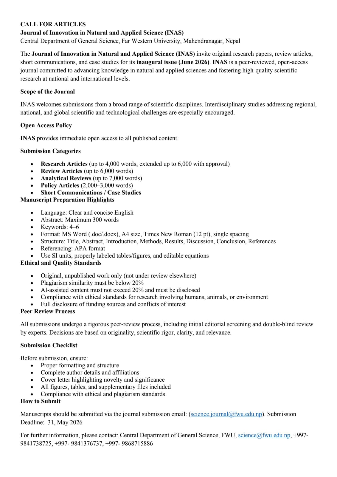Call for Article for journal of Innovation in Natural and Applied Sciences