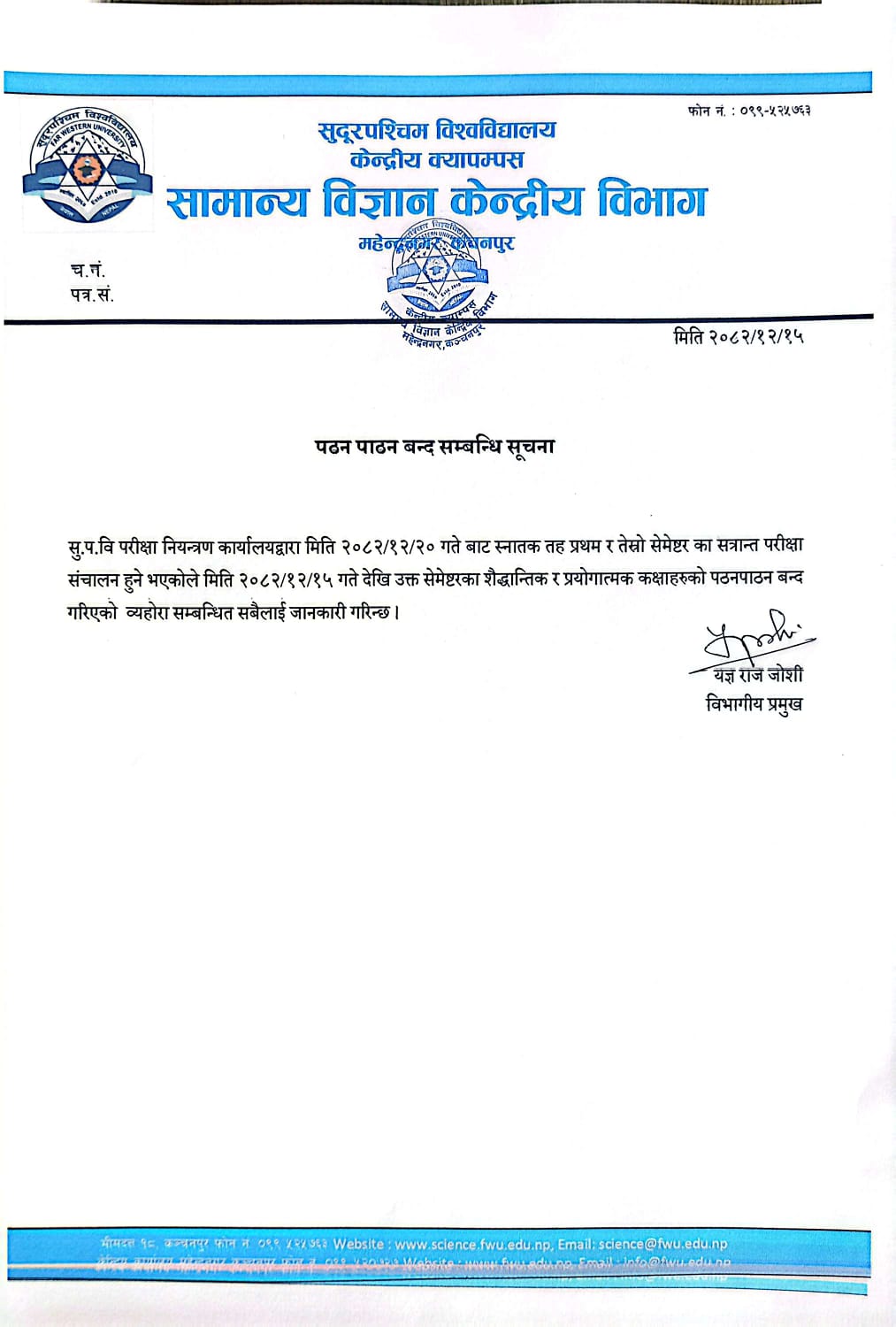 प्रथम र तेश्रो सेमेस्टर को पठन पाठन बन्द सम्बन्धि सूचना